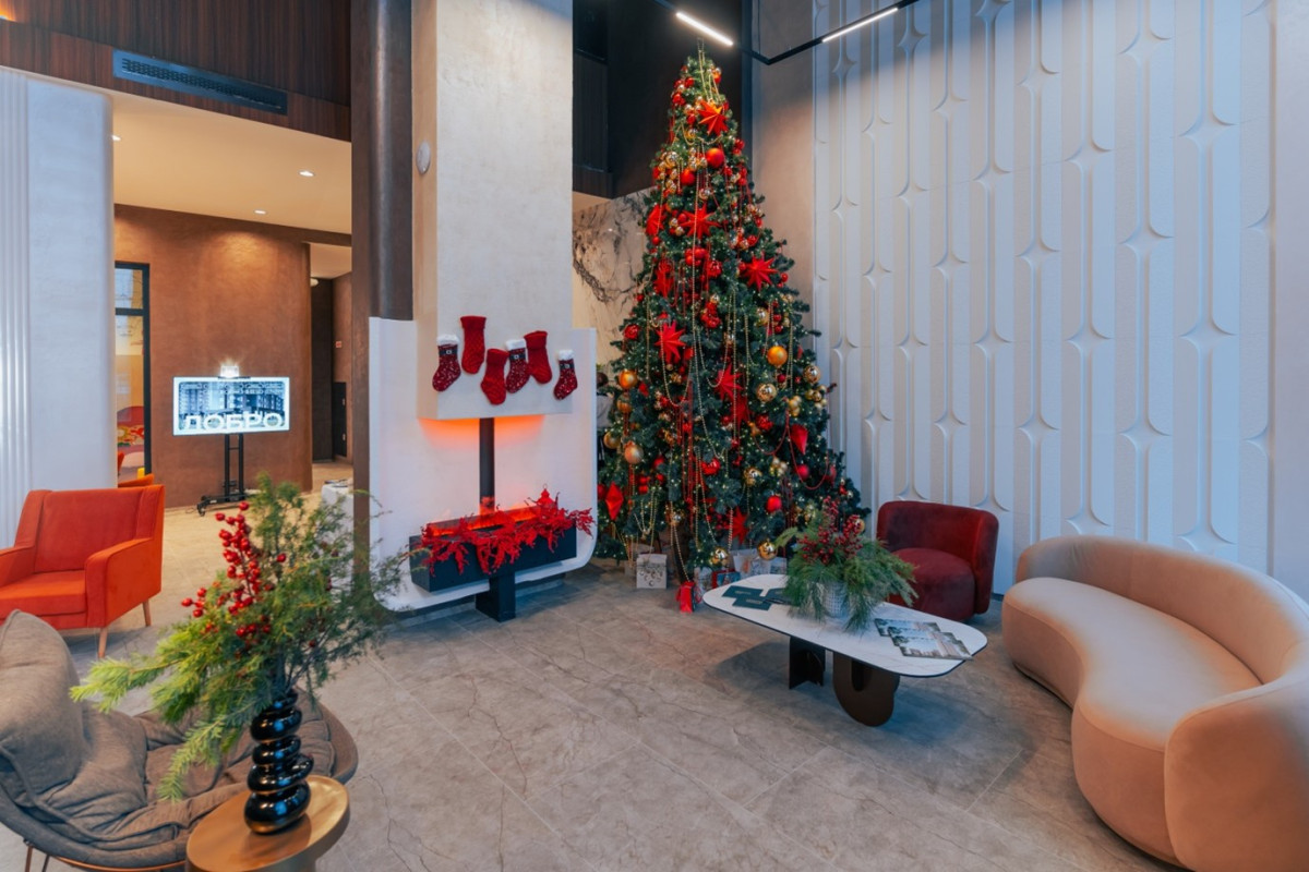 Гранд-лобби отличается семиметровыми потолками и панорамным остеклением. В нем создано несколько функциональных зон: ресепшн, кофейная и каминная зоны, коворкинг, комната для детей и игровая площадка с приставкой. Задача пространства — стать местом для работы, встреч и отдыха жителей.