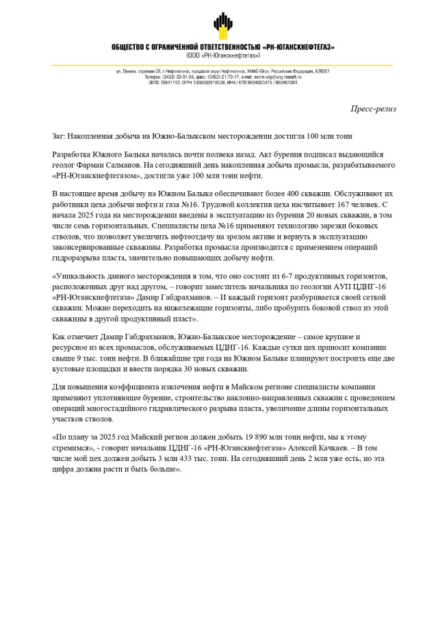 Разработка Южного Балыка началась почти полвека назад. Акт бурения подписал выдающийся геолог Фарман Салманов. На сегодняшний день накопленная добыча промысла, разрабатываемого «РН-Юганскнефтегазом», достигла уже 100 млн тонн нефти.