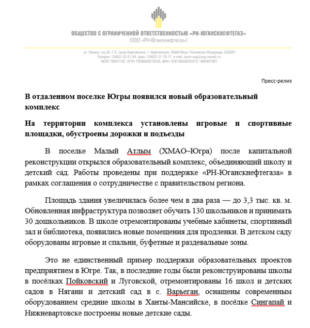 В поселке Малый Атлым (ХМАО–Югра) после капитальной реконструкции открылся образовательный комплекс, объединяющий школу и детский сад. Работы проведены при поддержке «РН-Юганскнефтегаза» в рамках соглашения о сотрудничестве с правительством региона.