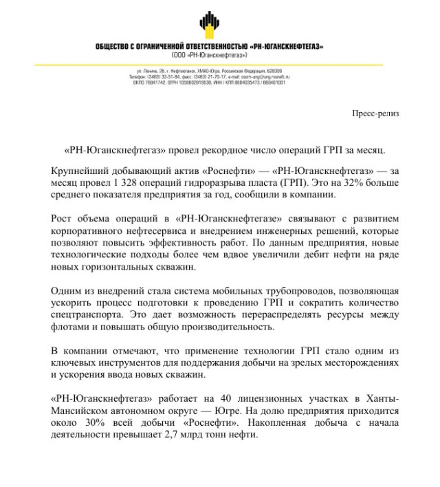 Крупнейший добывающий актив «Роснефти» — «РН-Юганскнефтегаз» — за месяц провел 1 328 операций гидроразрыва пласта (ГРП). Это на 32% больше среднего показателя предприятия за год, сообщили в компании.